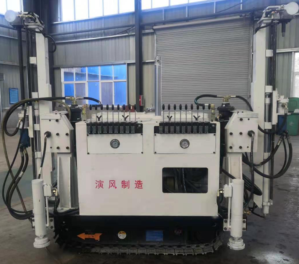切頂鉆機(jī)采用底部四根支撐油缸,支撐切頂鉆機(jī)底部,將切頂鉆機(jī)底板調(diào)平;車體中間有頂部支撐油缸,與底部四根支撐油缸配合,將切頂鉆機(jī)固定在巷道內(nèi);給進(jìn)與起拔力大,提高了鉆機(jī)處理卡鉆事故的能力;采用雙動力頭系統(tǒng),動力頭間距大可調(diào)200mm,可適應(yīng)孔距為500、600、700(mm)的鉆孔工作,提高了切頂鉆機(jī)的工作效率;液壓原件采用先進(jìn)定制產(chǎn)品,性能穩(wěn)定,通用性強(qiáng),質(zhì)量可靠。